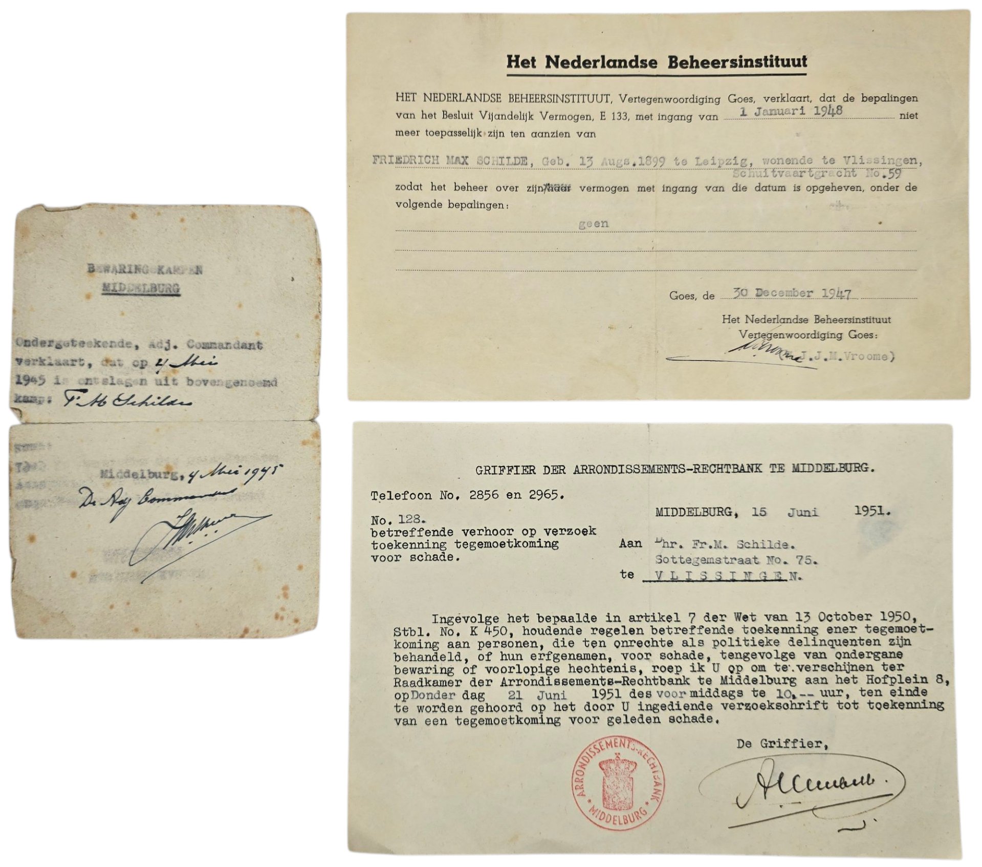 Original WW2 Dutch Document - Middelburg researched person, Vlissingen, Leipzig (1945)Zeeland. Paper remains on the backside. Three documents from a German person living in Vlissingen. He was researched on collaboration because of his German heritage. He was released on the 4th of May 1945. Two documents from 1948 and 1951 that clear him for being a collaborator.Origineel Wo2 Nederlands Document - Middelburg, voor collaboratie onderzocht persoon, Vlissingen (1945)Zeeland. Papierresten op de achterkant. Drie documenten van een Duitser die in Vlissingen woonde. Hij werd onderzocht op collaboratie vanwege zijn Duitse afkomst. Hij werd vrijgelaten op 4 mei 1945. Twee documenten uit 1948 en 1951 klaren zijn vrijlating als collaborateur.
