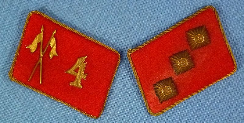 The red wool collar tabs have toned gold piping and gilt metal rank pips and unit insignia for the 4th Standarte of SA cavalry. The tabs show surface dust but overall they are in very good used condition.