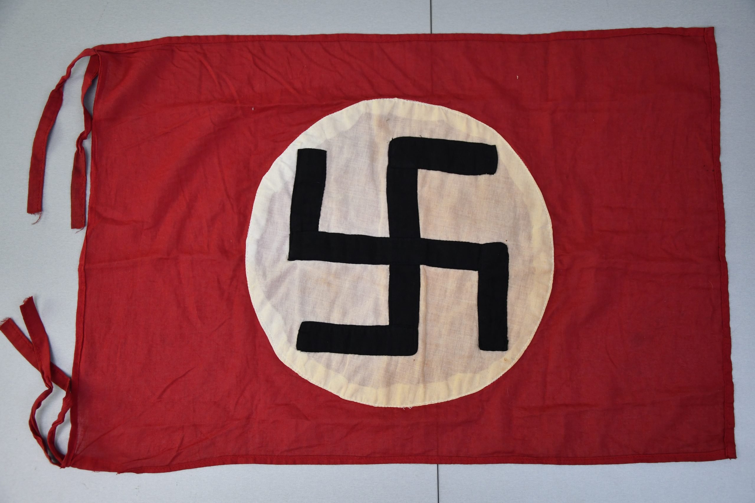 Very early, most like hand made, NSDAP sympathisers house flag, still showing a vertical placed swastika. Attachment loops present. Size 40 x 60.