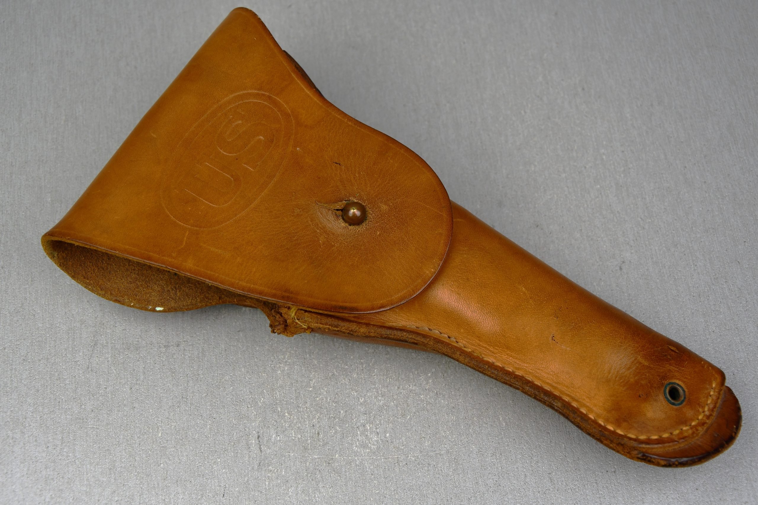 World War 2 US M1916 Colt Pistol Holster. The standard holster for the M1911 Colt pistol was first developed in 1916 and remained in production for the US Army all the way to 1945. The light brown leather holster is maker marked and dated 'Milwaukee Saddkery Co. 1945' . Nice example in very good condition!