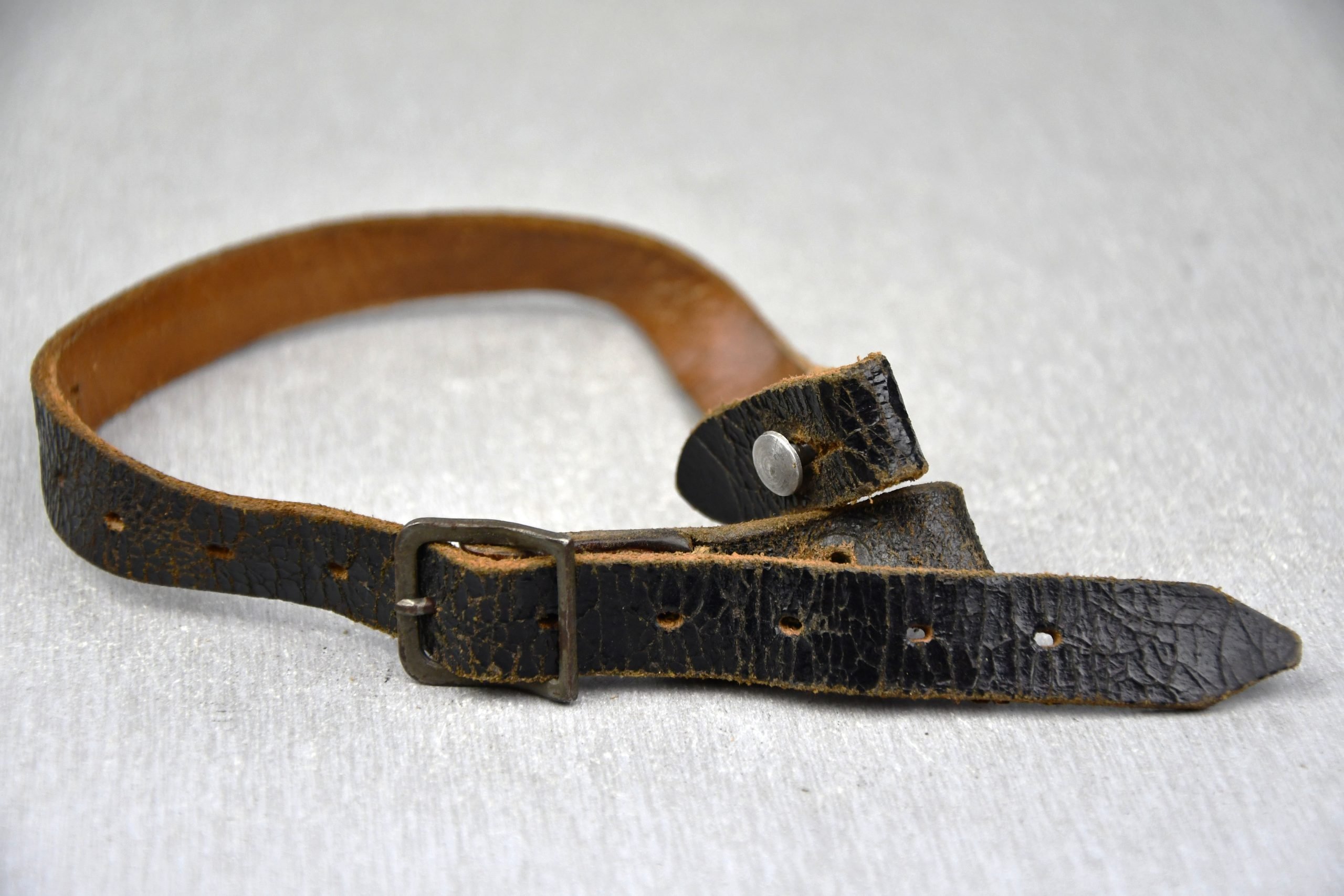 In my opinion an original, genuine, full length chin strap for a German World War Two helmet in good condition. Steel buckle in green color. No repairs. Light worn piece. Maker marked on the other tip by ftb (three letter code for the firm 'Landeslieferungsgenossschaft für das Tapezier-, Sattler-, Polsterer- u. Dekorateurhandwerk Baden e.G.m.b.H, Sitz Karlsruhe (Baden)) dated 1944