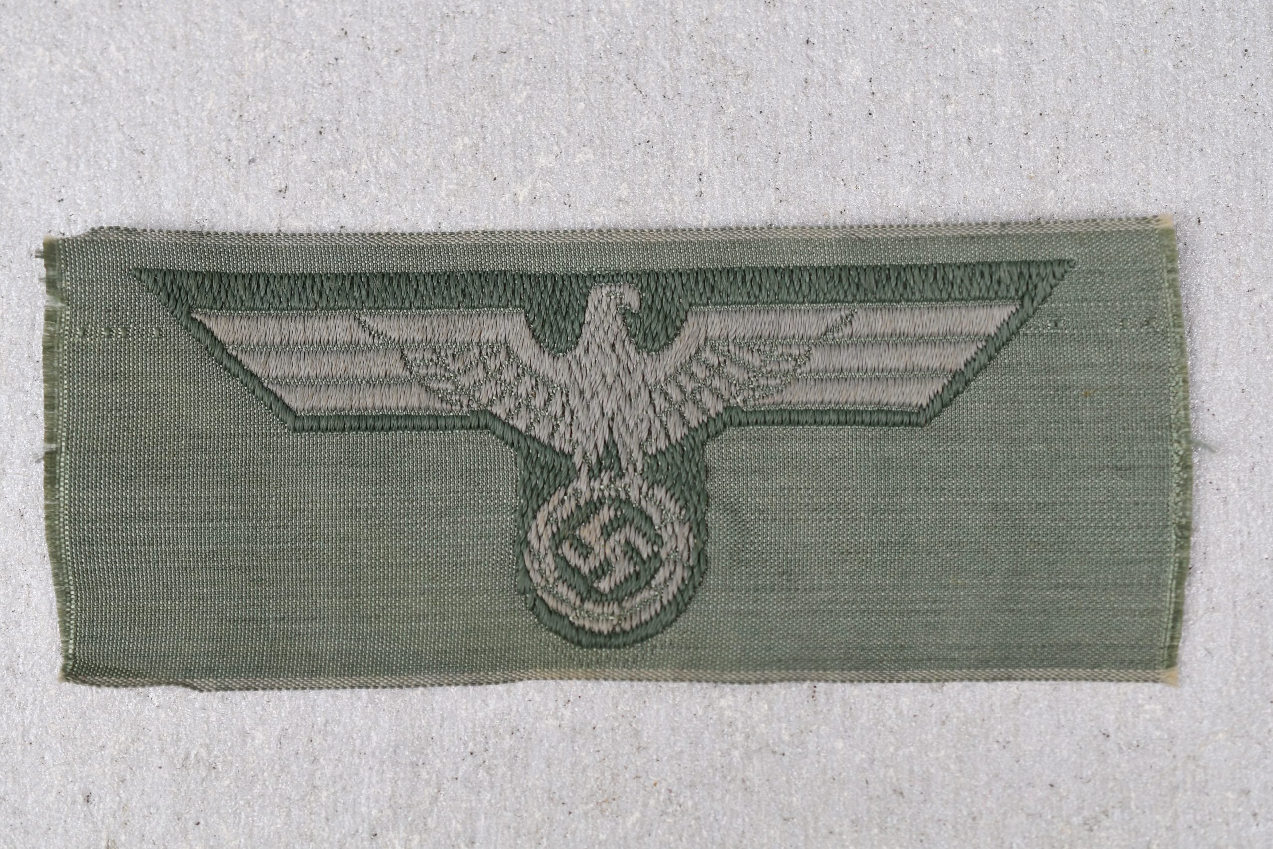 Standard M40 pattern flat woven BeVo-Weave (From the BeVo-Wuppertal cloth factory) cap eagle. Pale green example, issued in 1940. To be worn on a M34 pattern overseas-, M42-, or M43 army cap.