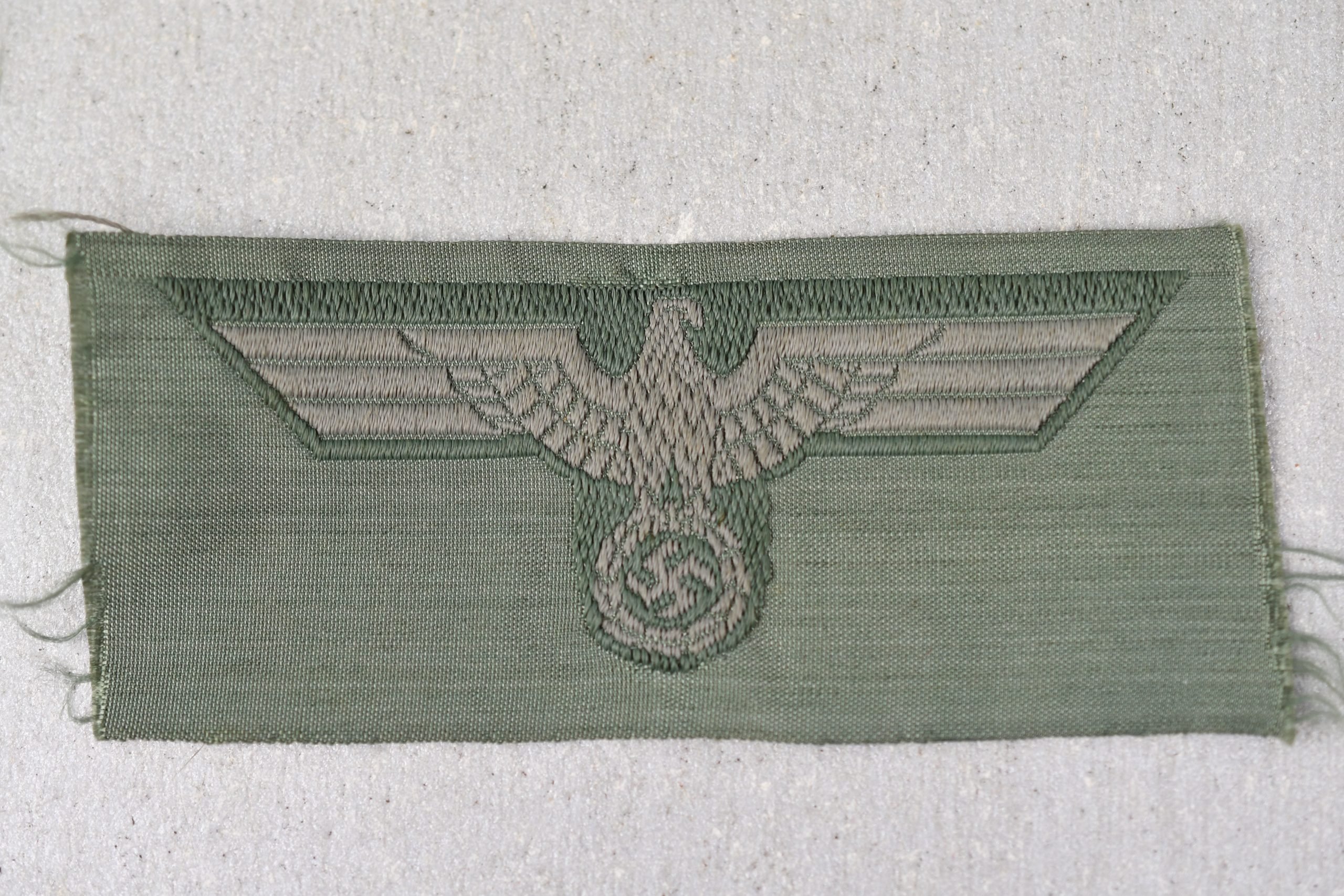 Standard M40 pattern flat woven BeVo-Weave (From the BeVo-Wuppertal cloth factory) cap eagle. Pale green example, issued in 1940. To be worn on a M34 pattern overseas-, M42-, or M43 army cap.