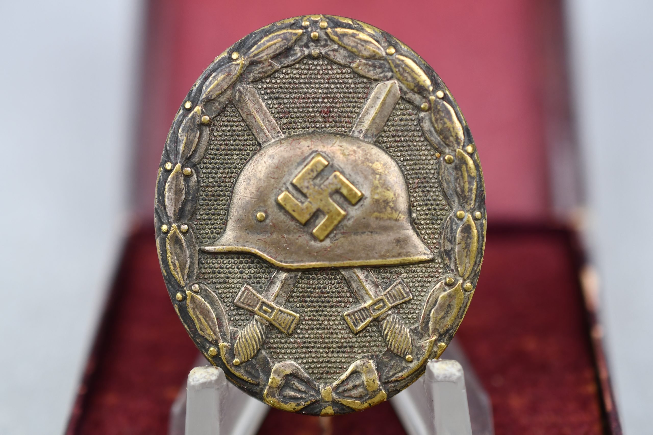 Solid tombac constructed wound badge in light worn condition. Silver grade example, maker marked with nr. 30 (Hauptmünzamt Wien). Comes with its matching award box in dark red color.