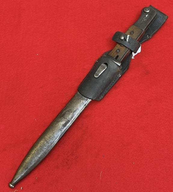 Matching number 8435 f K98 S244G code, not dated. Blued blade with wear at tip. Dent free scabbard, wooden grips securely held in place. Press stud in good working order. Comes with leather frog.Very scarce S code.Age restricted item