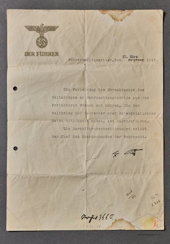 Der Führer Führerhauptquartier Document-This document is from the Führers headquarters and is dated 12 March 1943. It states that there will be a regulation to award the Honor Cross of the War Merit Cross to members of the Wehrmacht from the Protectorate of Bohemia and Moravia who fought in the world war on the German or Austrian side. The regulations were said to be issued by the Chief of the High Command of the Armed Forces and it has an auto pen signature of Hitler. This has two punch holes from being filed. There are stains and it is quite creased and folded but it is complete and there are a number of hand annotations as well. It measures 8 ¼' by 11 ½'. Very interesting!