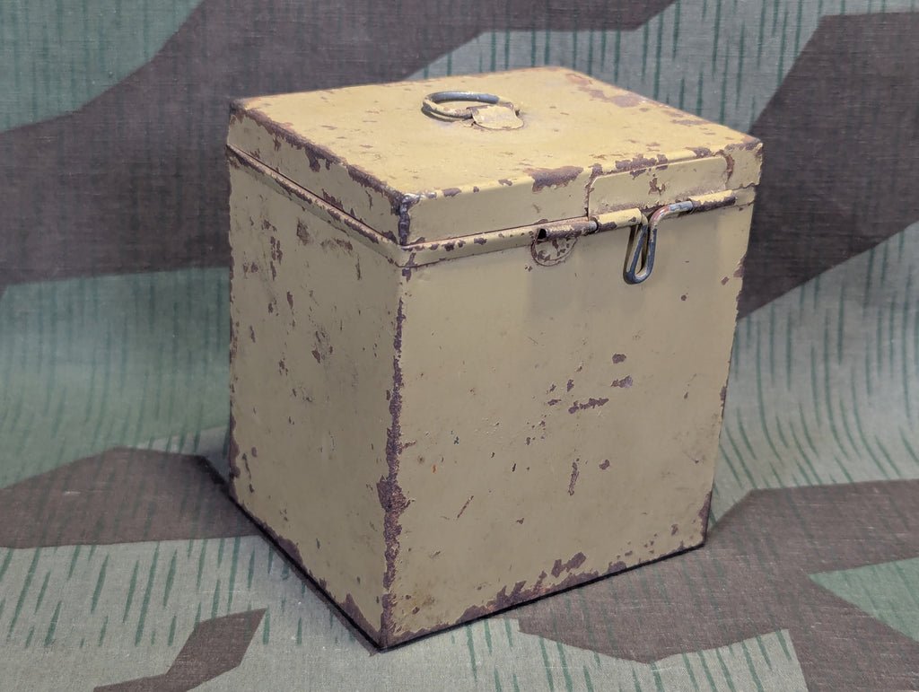 Original tan medical style tin. This style tin is normally found in the large DRK medical boxes, but I have also seen these in the werkbank organizers for the machine shop trucks. I am not sure which this one is, but I am leaning towards machine shop, because it isn't stenciled or labeled like you would expect for the medical box. Its a bit worn and dirty, but still fairly nice.