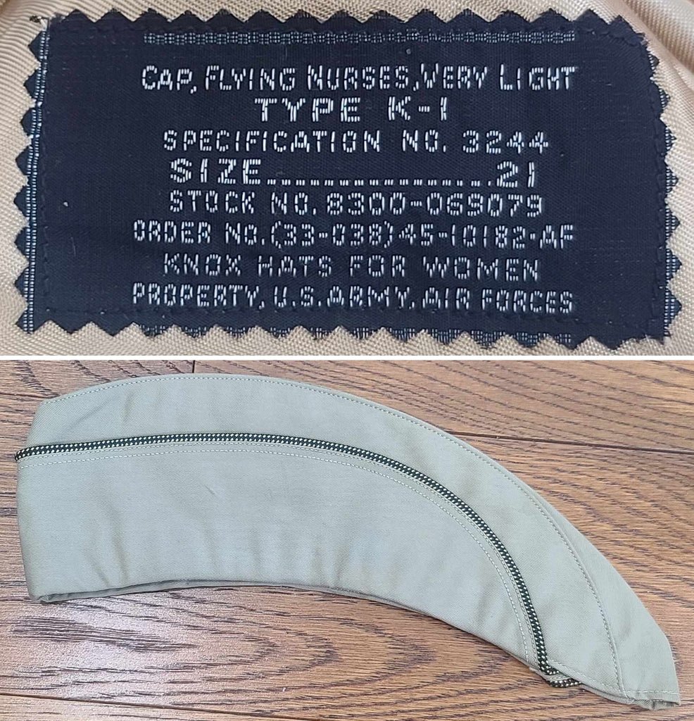 Original WWII flight nurse K-1 garrison cap. Size 21. Knox and Army Air Forces logos on the lining. OK condition with some flaws. There is a red stain on one side (I was told it was lipstick but I don't know for sure), a small rust colored spot and a few stray brown specks. I have not attempted to launder it, so I don't know if the stains will come out.