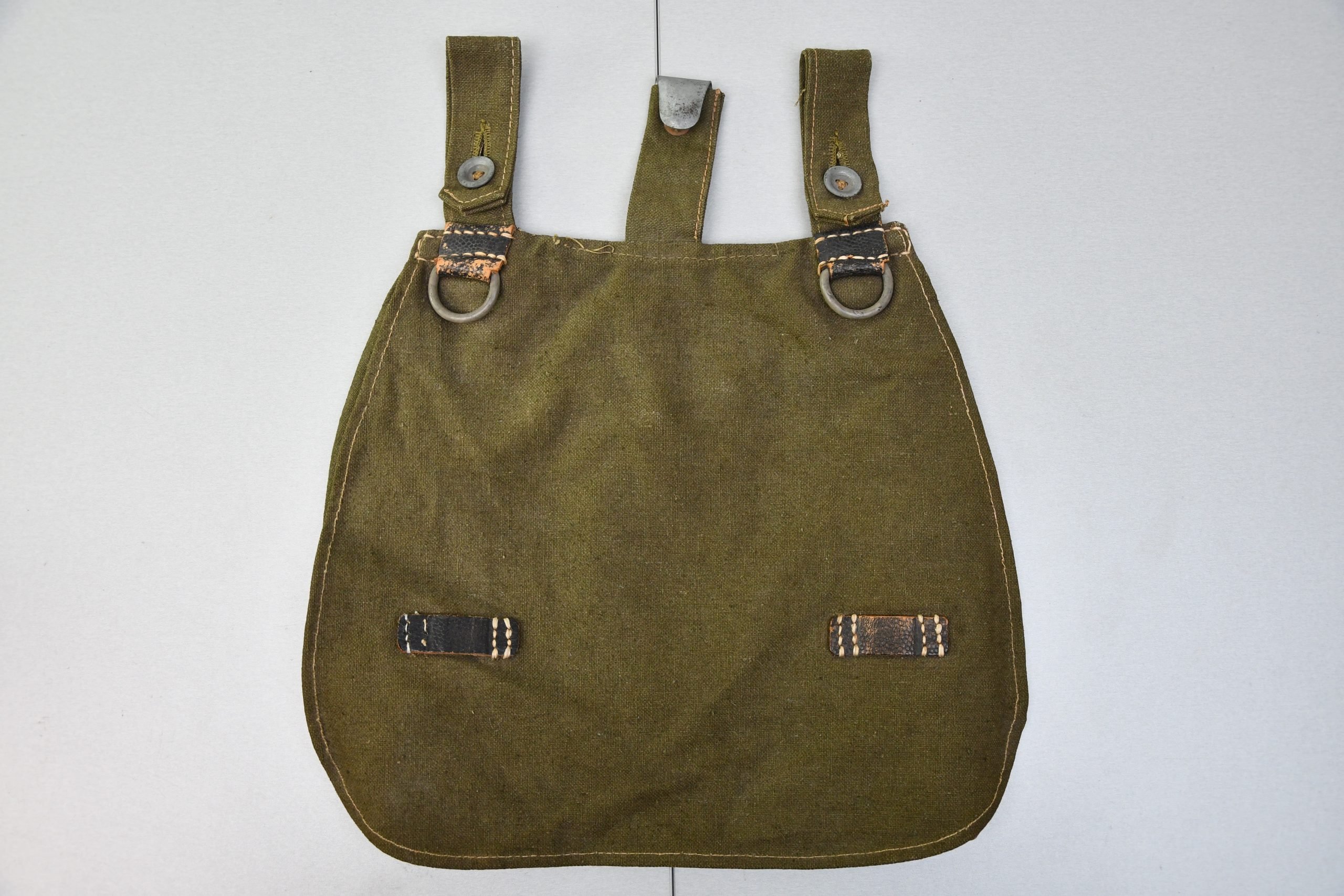 Genuine light worn M31 pattern Wehrmacht bread bag ingood condition. Mid war manufacturing ca. 1943 and marked with a RBNr. (partially faded). Complete with all hooks, straps and buttons. Executed in green canvas cloth.