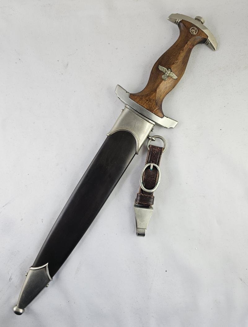 Dague SA - HACO BerlinTrès bel exemplaire précoce du fabriquant berlinois HACO, pour le groupe de SA de Berlin comme indiqué par le 'B' présent sur la croisière inférieure.La poignée ainsi que l'aigle et le bouton de runne présentent un ensemble très réussi sur cet exemplaire.Le fourreau est anodysé comme il se doit et les ferrures sont également en maillechort, comme l'ensemble des parties métalliques de cette dague.Présence de quelques traces d'oxydation sur la lame, mais la devise tout comme le logo fabriquant sont encore très vifs.