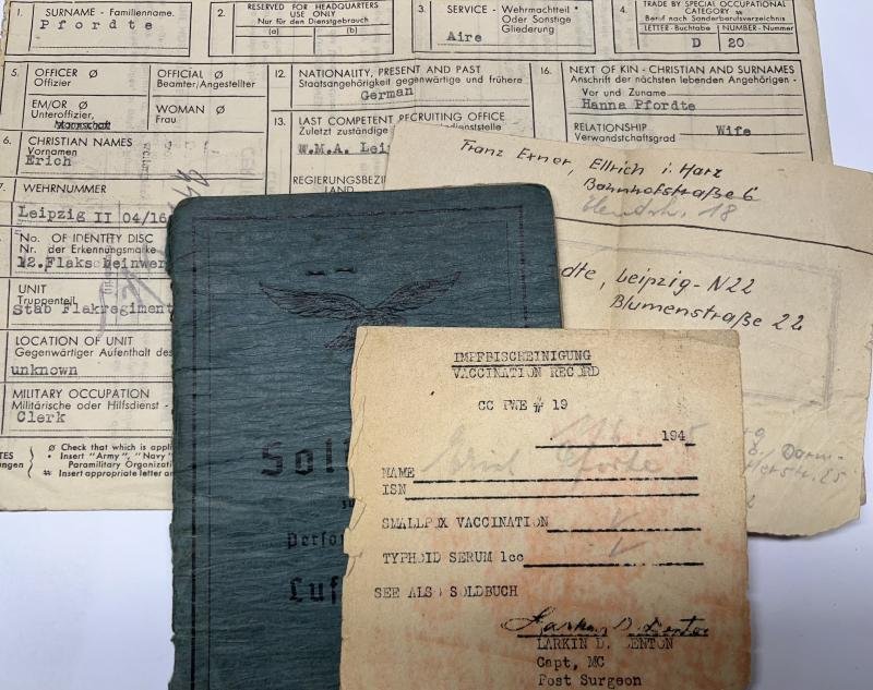 Soldbuch of 'Wachtmeister' Erich Pfordte who served in several different Flak units and ended up within Flak Rgt.47 of the 21.Flak Div.Pfordte was only awarded the 'Ostmedaille' which is not that strange to his function of clerk.Pfordte had his last equipment issued on 13-1-1945 and participated in fightings in the 'Ruhrgebiet' as part of the III.Flakkorps.April 1945 the 22.Flak Div. was taken POW or destroyed near Iserlohn.Comes with some nice added extras!