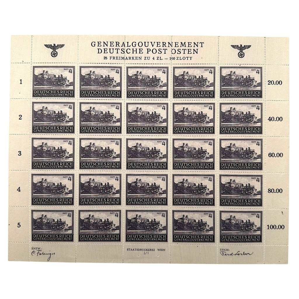 This complete stamp sheet from the General Government (Deutsche Post Osten), issued during the Second World War, contains 25 unused 4-Zloty stamps produced for the German-administered territories in occupied Poland. The stamps feature a detailed depiction of a historic building and bear the inscription Deutsches Reich / Generalgouvernement. The sheet remains fully intact, including perforations, margin numbers, and original printing details such as design and printer markings.An interesting and well-preserved piece, ideal for collectors of wartime and occupation issues!Article number: 17253