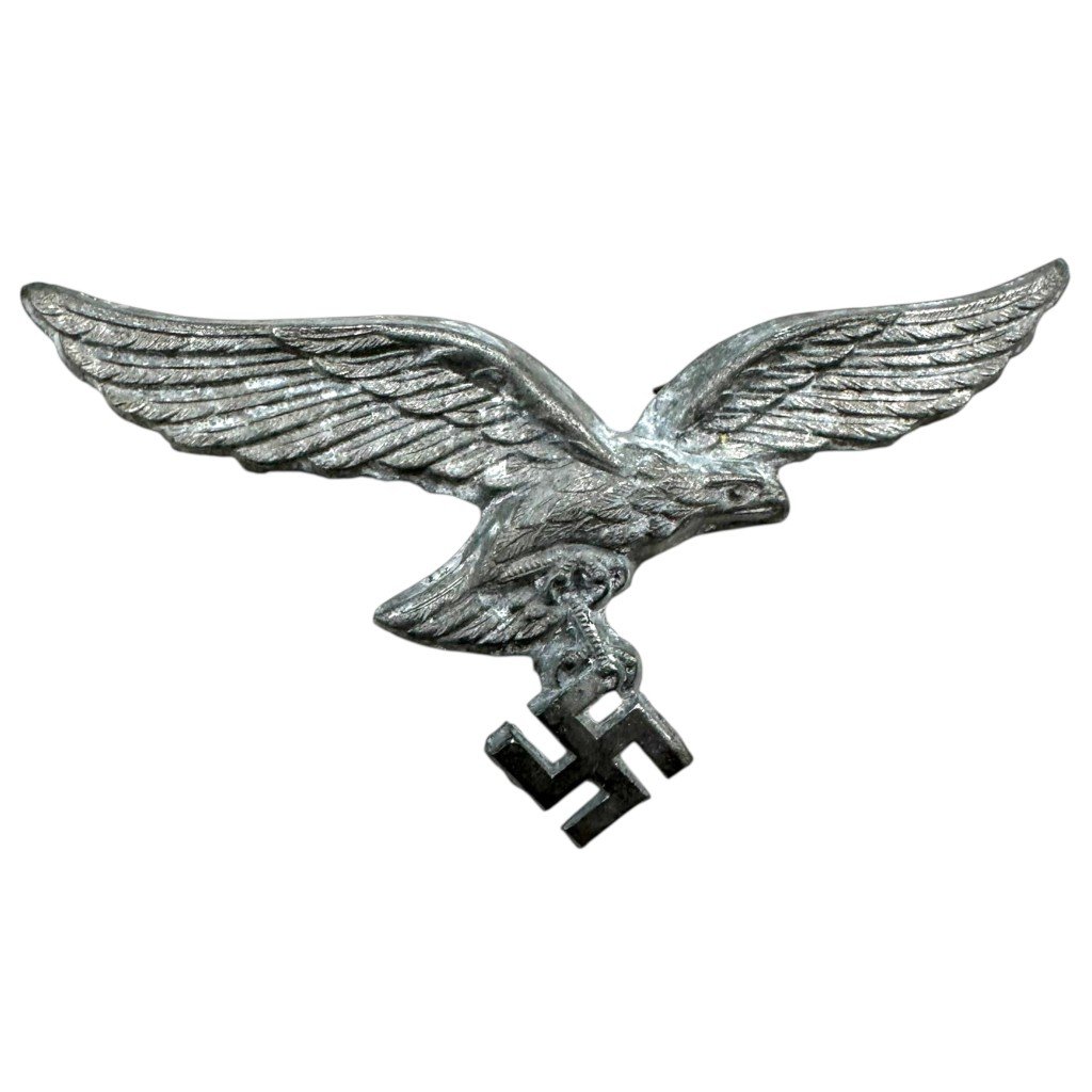 This metal Luftwaffe cap eagle from the Second World War is made of silver-coloured metal and features the characteristic flying eagle with the swastika beneath it. The original attachment pins are still present on the reverse. This type of insignia was worn on the visor caps of Luftwaffe personnel.An interesting addition to any Luftwaffe collection.Article number: 17247Originele WWII Duitse Luftwaffe metalen pet adelaarDeze metalen petadelaar van de Duitse Luftwaffe uit de Tweede Wereldoorlog is uitgevoerd in zilverkleurig metaal en toont de karakteristieke vliegende adelaar met het swastika daaronder. Aan de achterzijde zijn de originele bevestigingspinnen nog aanwezig. Dit type embleem werd gedragen op vizierpetten van Luftwaffe-personeel. Een interessant stuk voor de Luftwaffe-verzameling.