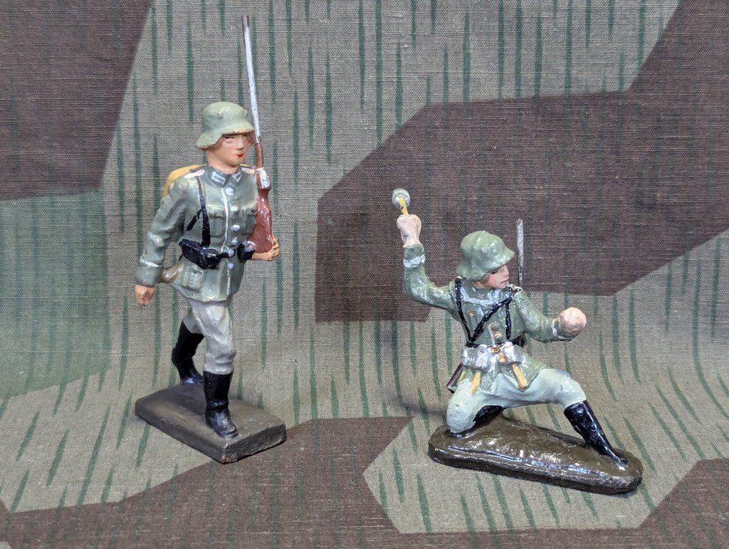 Prewartoy soldiers. One is made by Lineol and the by Fröha.Price is for both.They are in rather good condition, although I am not sure if the paint is the original color. The rifle is a little bent on the grenade throwing soldier and there might be some material missing from the rifle, I am not sure as almost every rifle I have seen on these is just a wire. They are pretty delicate and can break if dropped.
