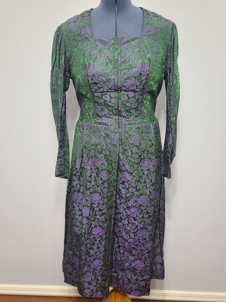 Vintage 1930s / 1940s German traditional dirndl dress.MEASUREMENTS (approximate):Bust- 40'Waist- 34'Hips- 50'Length- 47'Sleeve- 24'End of Cuff- 7'Maria Schöttl-Lochner Bad Tölz Marktstr, 61 label. The dress is a heavier weight winter material. The green has a nice iridescent shine to it. The front closes with hooks and eyes - the rotate each side so it stays fastened more securely. The front where the hooks and eyes are has boning like a corset. Snaps below the hooks and eyes and at the end of the sleeves. One side pocket. Overall very good condition. There are sweat shields sewn in - the sweat shields have some light staining, but the dress does not.