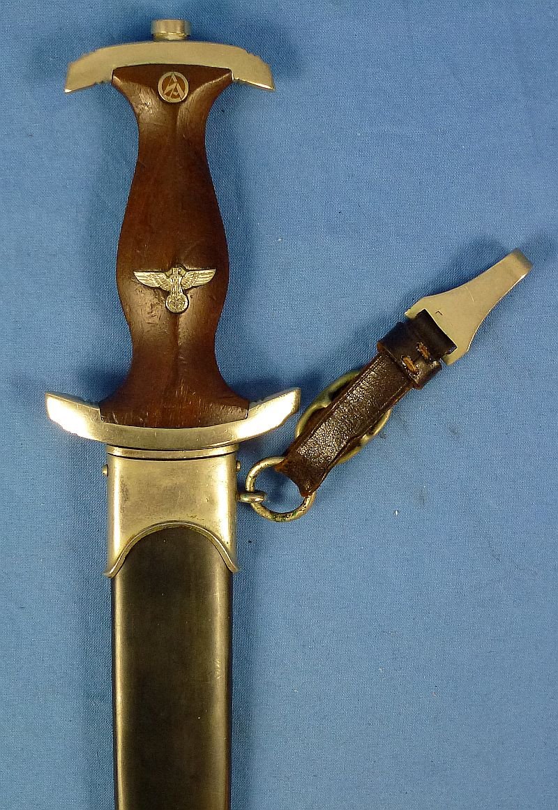 The obverse side of the blade shows spots, surface grime, and typical runner marks, but with visible cross grain being evident. There is dark and intact burnishing of the motto with very good contrast against the blade. There are a few small dark blemishes on the blade surface, primarily just below the 'A' in the motto of 'Alles fur Deutschland'. The reverse ricasso bears the scarce maker mark of the firm of Neidhardt & Schmidt of Brotterode. The maker mark is quite faint on the blade, with the entire reverse blade surface showing the signs of burnishing, with this process having left the maker mark intact, but somewhat indistinct. The wooden grip has a very well detailed nickel political eagle inset into the grip. At the top of the grip is the enamel SA runes button which is without damage. The grip itself shows typical scratches and indentations from carrying wear, but it is without chips or cracks and it fits the guards very well. The guards show a fine and uncleaned patina, with the plating of the guards being largely intact. The reverse of the lower guard bears the 'BO' mark of SA Group Bayerische Ostmark. The dagger is tight within the scabbard. The black scabbard shows only minor wear to the anodized finish, but the finish is for the most part complete and intact. The scabbard fittings, like the guards, have a fine and uncleaned patina. The brown leather dagger hanger is supple, with the nickel plated belt clip also having an uncleaned patina. Overall the dagger is in very good condition.