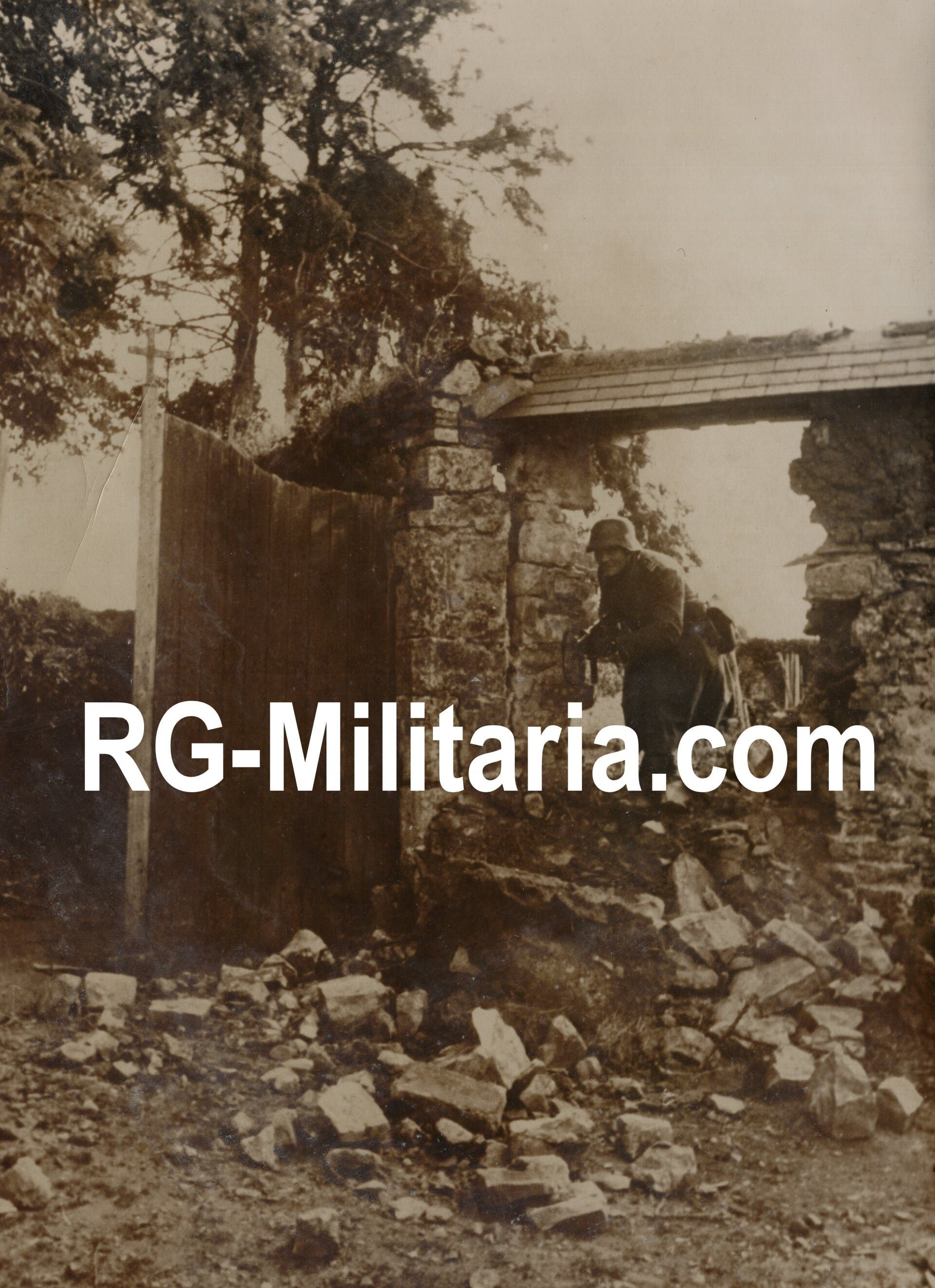 Original WW2 German Press Photo - Eastern European Wehrmacht volunteer in a village in Normandy, Operation Overlord, France (1944)Approximately 18 x 13 cmBy Kriegsberichter PlenikOriginele Wo2 Duitse Persfoto - Oost-Europese Wehrmacht-vrijwilligers in een dorp in Normandië, Operatie Overlord, Frankrijk (1944)Ongeveer 18 x 13 cmDoor Kriegsberichter Plenik