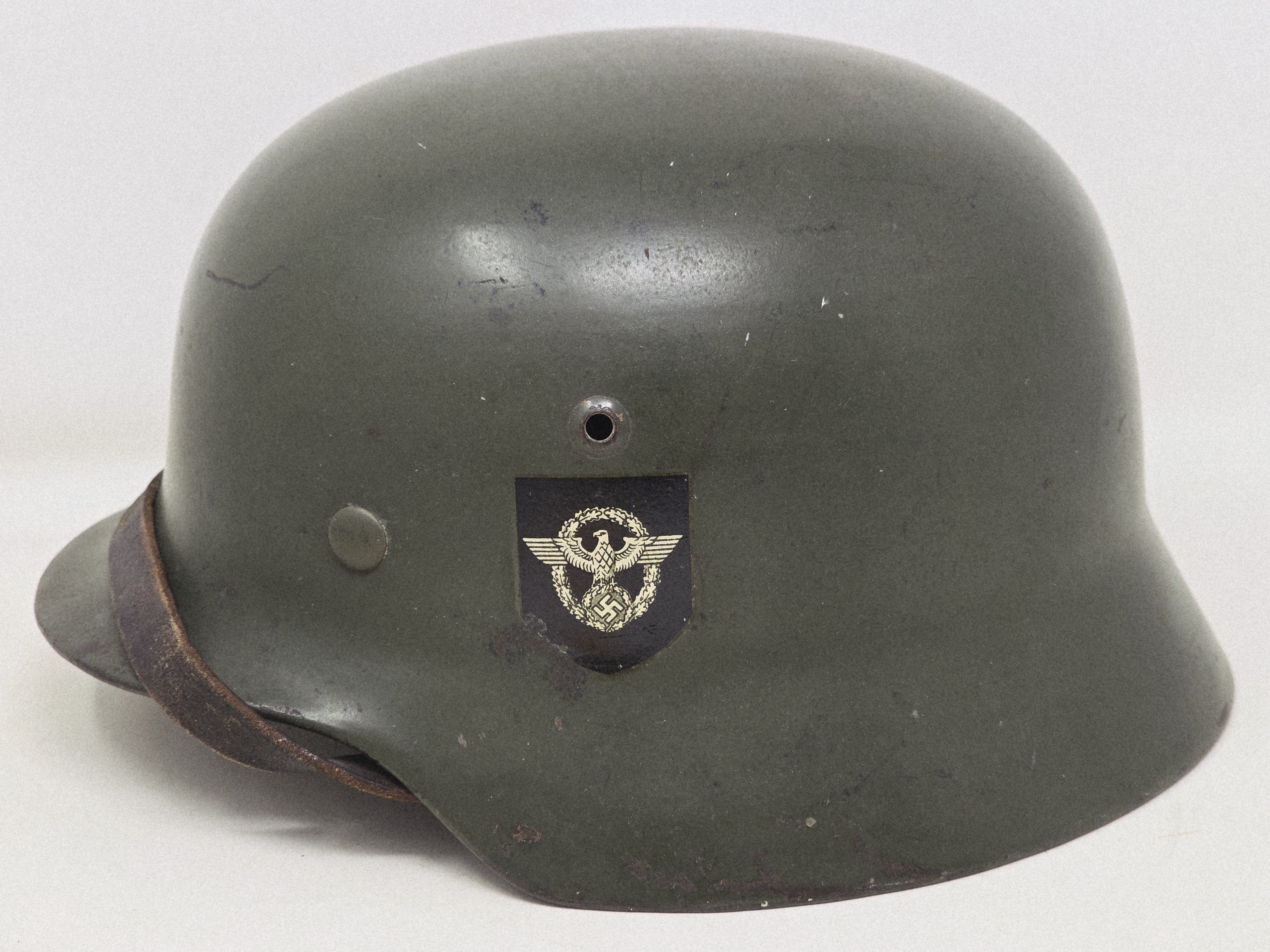 This is an ET66 double decal Police M35, #3652, with a near mint finish and decals. The liner and strap show very light service use, and the decals are nearly 100%, with a slight gouge on the forward bottom edge of the police shield. A very fine addition to any SS/ Polizei headgear collection. COA accompanies.