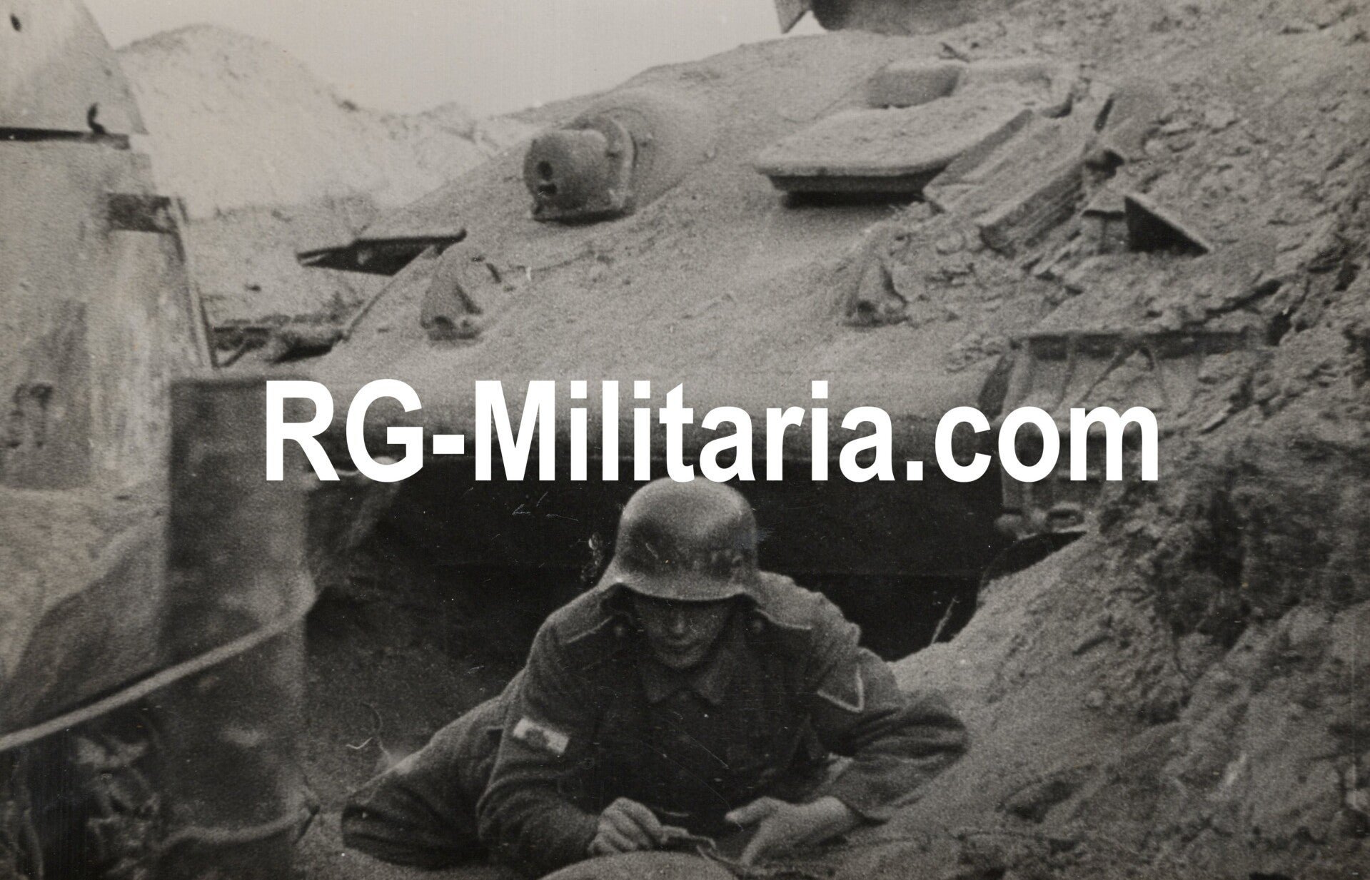 Original WW2 German Press Photo - German tank destroyer under a destroyed Soviet T-34 tank