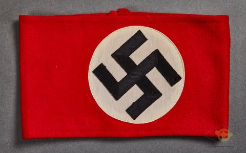 German WWII Scarce Wool SS Armband for Overcoat-This example is excellent! It is produced in red wool that is super clean and damage free. The ends are not sewn together. The center has a separately applied white disc with multi piece black cloth swastika. There is a paper SS RZM tag affixed to the reverse. Excellent and desirable!