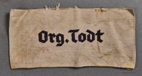 German WWII Scarce Org.Todt Armband-This is a scarce armband, in a cloth beige, with a BeVo Org.Todt script embroidered on the face. This was removed from a uniform, you can tell by the remaining stitches and slight fraying at the top and bottom. This is very nicely marked with the BeVo Wuppertal marking on the reverse. It is sewn in the back. A scarce armband in very good condition.