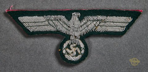 Veteran Bring Back German WWII Army Officer's Breast Eagle-This looks to be unissued. This army officer's breast eagle is made of a bright silver bullion on a black badge cloth. This is interesting, as it has both backings, with a cloth backing is red in color and a paper backing that is still in place. A gorgeous piece. This army eagle was brought home by a US veteran. We will supply the name of this soldier to the buyer.