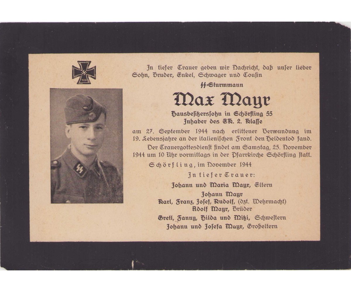 Death notice of Max Mayr who died in September 1944 in Italy.