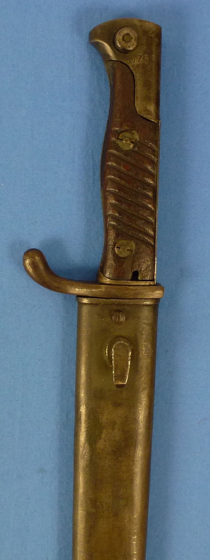 The blade shows typical spots, stains and surface dirt, but it is without nicks, chips or active rust. The ricasso bears the firm name of Simson & Company. The spine has the date of '16'. The bayonet is the model with a flash guard on the grip spine and with the vestigial 'ears' of the muzzle ring. The wood grip plates show age and patina, as well as pock marks from carrying wear, but they are without chips or cracks. The guard and the pommel show age but retain original finish. The guard has a numeric marking which appears to be '8235'. The pommel bears the marking of 'WZ88'. The scabbard shows age, but the finish is largely intact. The rear scabbard throat has an indistinct number. Overall the bayonet is in good field used condition.