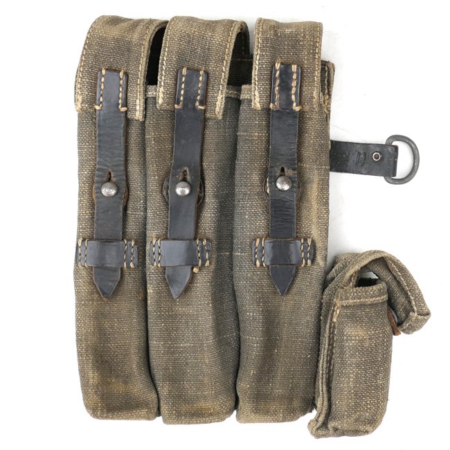 This is a nice original Wehrmacht (Heer)/Luftwaffe MP38/40 Magazine Pouch (MP38 u. MP40 Magazintasche). Soldiers equipped with the MP38/40 were issued a pair of magazine pouches which each held three thirty-two round magazines.This is a left side pouch with an additional compartment where a speed loader was kept. This pouch is made of bleu-grey coloured canvas with blackened leather straps, the leather straps are in good and still supple condition. The pouch is not visible maker marked and dated 1942. Hard to find original MP38/40 magazine pouch in good used condition!