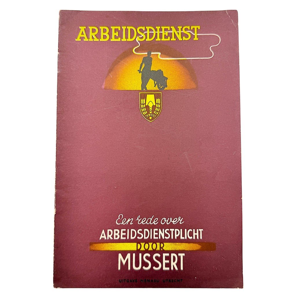 This Dutch Nederlandsche Arbeidsdienst (Labour Service) brochure from World War II (1942) is a piece of propaganda published by NENASU Utrecht, containing the full text of the speech 'Een rede over den Arbeidsdienstplicht door Mussert'.The booklet is in good, used condition with minor signs of age.An interesting addition to any Dutch collaboration or NAD collection!Article number: 17308Originele WWII Nederlandsche Arbeidsdienst brochure – Een rede over den Arbeidsdienstplicht door MussertDeze Nederlandse Arbeidsdienst-brochure uit de Tweede Wereldoorlog (1942) is een propagandistisch drukwerk uitgegeven door NENASU Utrecht, waarin de toespraak 'Een rede over den Arbeidsdienstplicht door Mussert' volledig is weergegeven. Het exemplaar verkeert in nette, gebruikte staat met lichte ouderdomssporen. Interessant voor de Nederlandse collaboratie of NAD collectie!