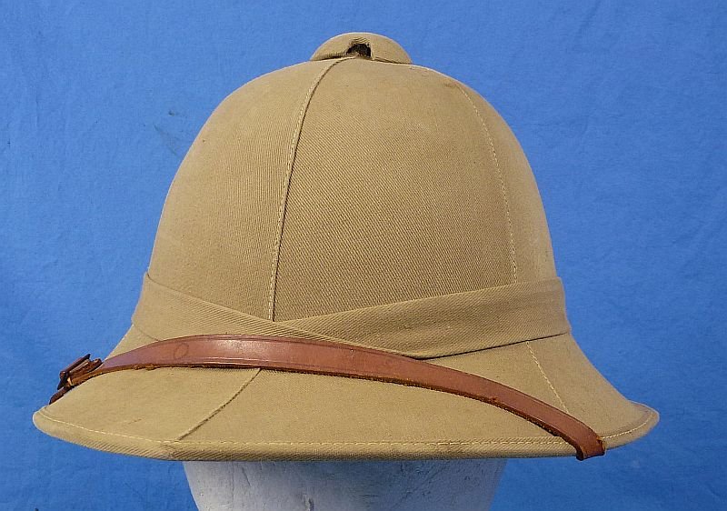 The khaki cloth pith helmet shows some exterior spots and a minor indentation on one side, but overall it is in very good field used condition. The interior is broad arrow marked as well as manufacturer marked and dated 1942. The interior leather sweatband bears the name of 'Major Gracey' with another name having been crossed out on the sweatband. The pith helmet is marked as a size 6-3/4.