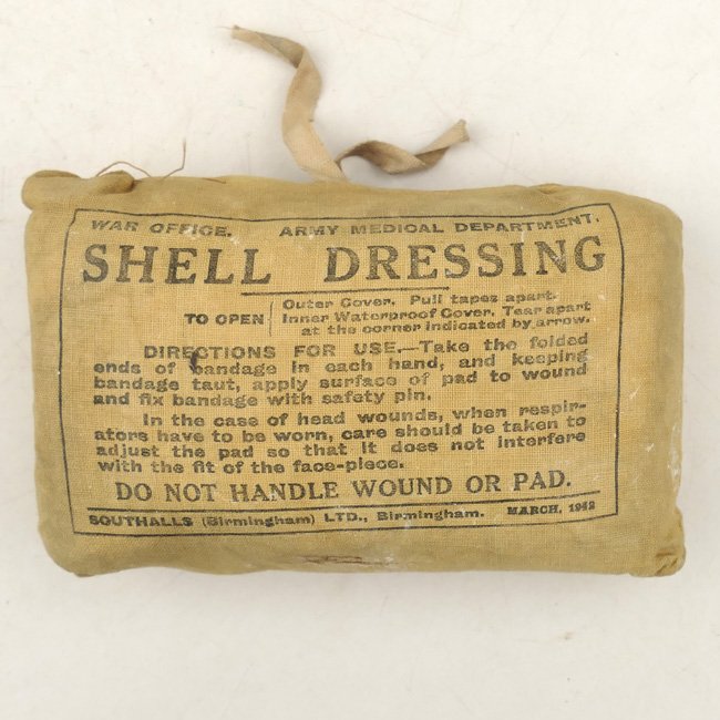 British Shell Dressing Bandage Package (War Office Army Medical Department) as used by the army. The package is nicely maker marked by the company 'Southalls (Birmingham)' and dated March 1942. Nice original bandage package in good unissued condition!