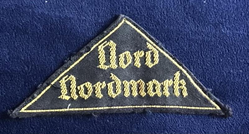 District Triangle (Gebietsdreieck) for the Nord Nordmark region . The golden yellow lettering on a black background indicates this is a male type specimen for the Hitler youth, while female type BDM versions typically featured silver white lettering.