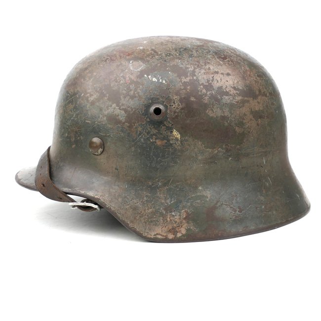 WH (Heer) M35 Double Decal three tone camouflaged combat helmet (Stahlhelm M35). The steel construction M35 helmet is showing a nice three-tone spray paint camouflage in brown/green/tan paint that is normally referred to as 'Normandy' camouflage, a standard 'Heeres' decal is still visible beneath the camouflage paint. All three liner retaining rivets are intact. The interior of the helmet is an early M31 leather liner with all eight fingers intact and the original liner cord is present as well. The early liner is having a reinforced aluminum ring. The liner is dated 1938. The shell is marked with maker and size 'ET62' which indicates production by the company 'Eisen-und Hüttenwerke, AG' in Thale/Harz. The reverse interior neck guard apron has a stamped serial number '3859'.The helmet is complete with its original chinstrap as found together, the early chinstrap is having a aluminum roller-buckle and studs. There are normal traces of wear and usage, the helmet is in overall good used condition. This helmet is a great original combat worn and used camouflage helmet in untouched condition. This would be a great addition to any helmet/camouflage collection. Stunning original helmet!