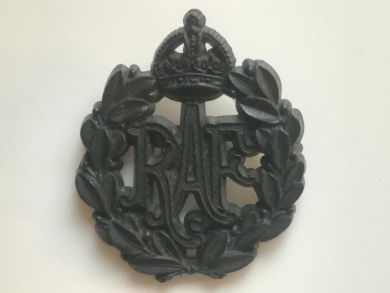 An RAF in near mint condition, Bakelite, or plastic economy cap badge for wartime use by the RAF. approx 1.75' by 1.5' with brass prong fittings. maker marked on reverse Stanley and sons Walsal.