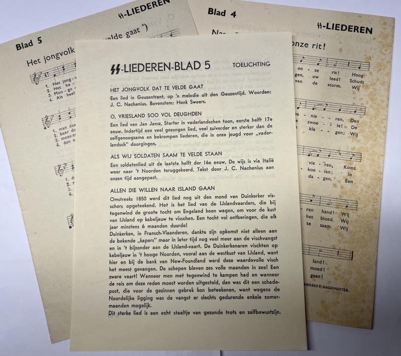 Rarely seen 'SS-Liederen' (Dutch SS songs) sheet 4 + 5 + toelichting (explanation)