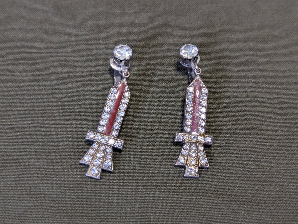 Very nice vintage art deco clip on earrings in decent condition. There is a little discoloration from age, but you could probably clean them up. These are very striking in appearance, not your typical boring earrings from the era. No markings. They look to me like they are made of sterling, but I will not say that outright because I am not sure. Assume they are not made from silver.