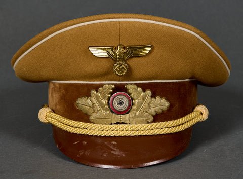 Kreis Level Political Leader's Visor Cap-This German Political Leader's Cap is piped in white as this is for the Kreis (district) level. This example is choice. There is no mothing at all. The body is made of a tan cloth material in a tricot weave with the brown velvet center band. The top has a fine saddle shape. The insignia consists of the long straight winged political eagle and the fancy wreath configuration with enameled political cockade. These both retain the majority of their finish and show a nice matte gold gilt. This cap has a nice early bullion chin strap which is secured by two gold pebbled buttons. The visor shows some slight scuffing so please see photos. The interior of this size 58 cap is lined in gold rayon that is very clean. The sweatband and moisture shield are in place and excellent. There is tissue paper still in place inside this cap. There is a diamond shaped moisture shield with a size tag that reads '58'. There is no RZM tag on this example. Again, a choice example.