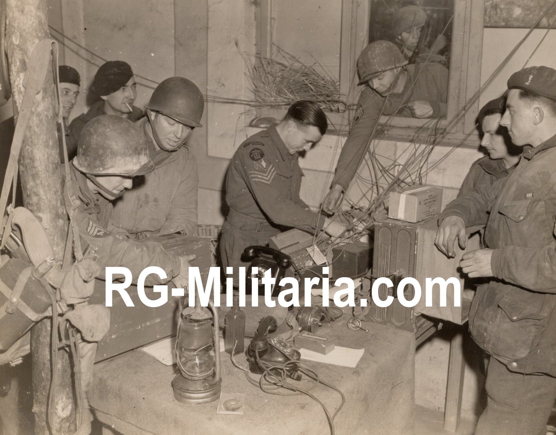 Original WW2 US Press Photo - US 8th Armored Division with British 7th Armored Division and commandos operating the radio at the front lines near Roermond, Holland (1945)