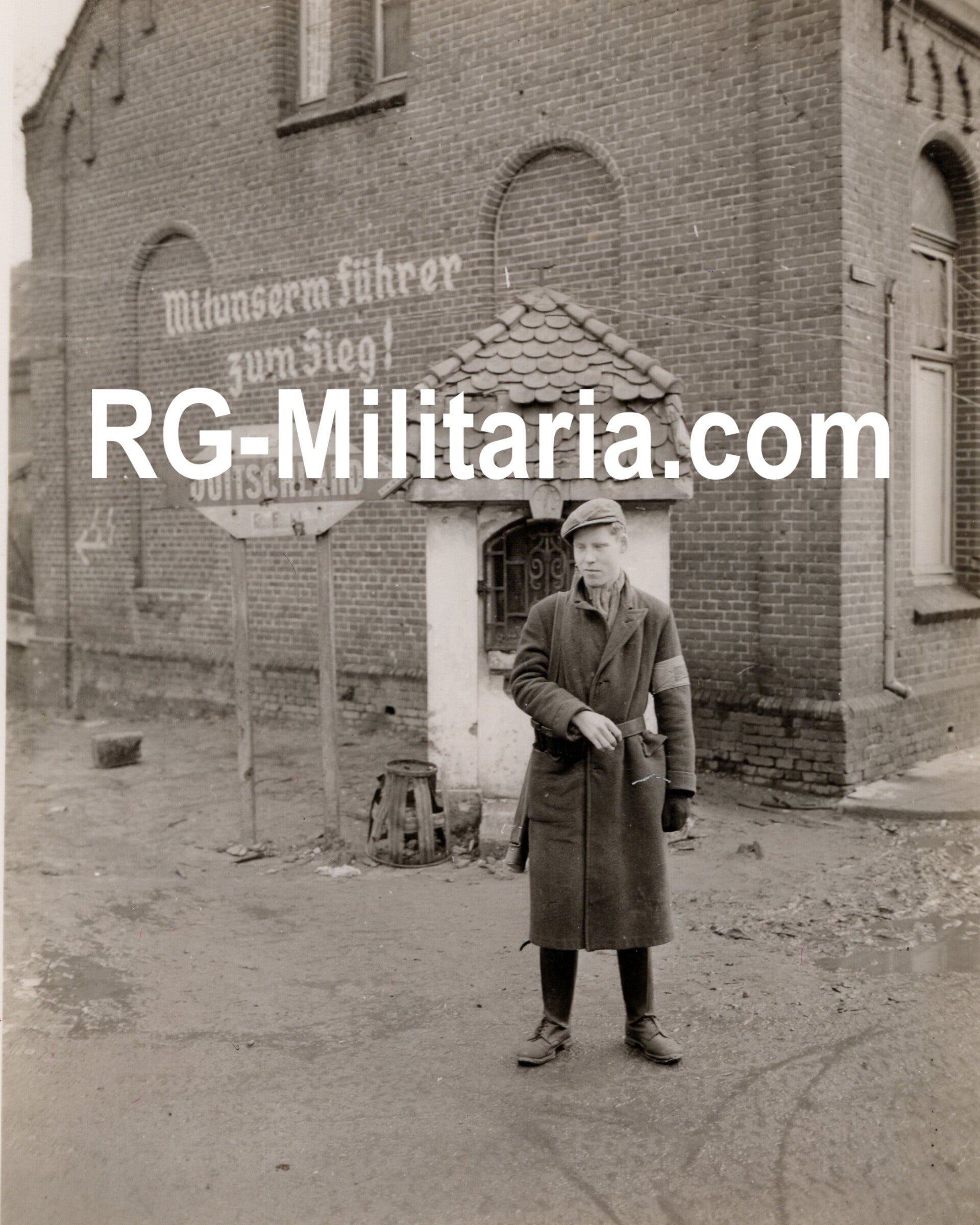 Original WW2 US Press Photo - Dutch NBS resistance fighter with graffiti wall ''Mit unserem FĂŒhrer zum Sieg!'' in Echt, Holland (1945)