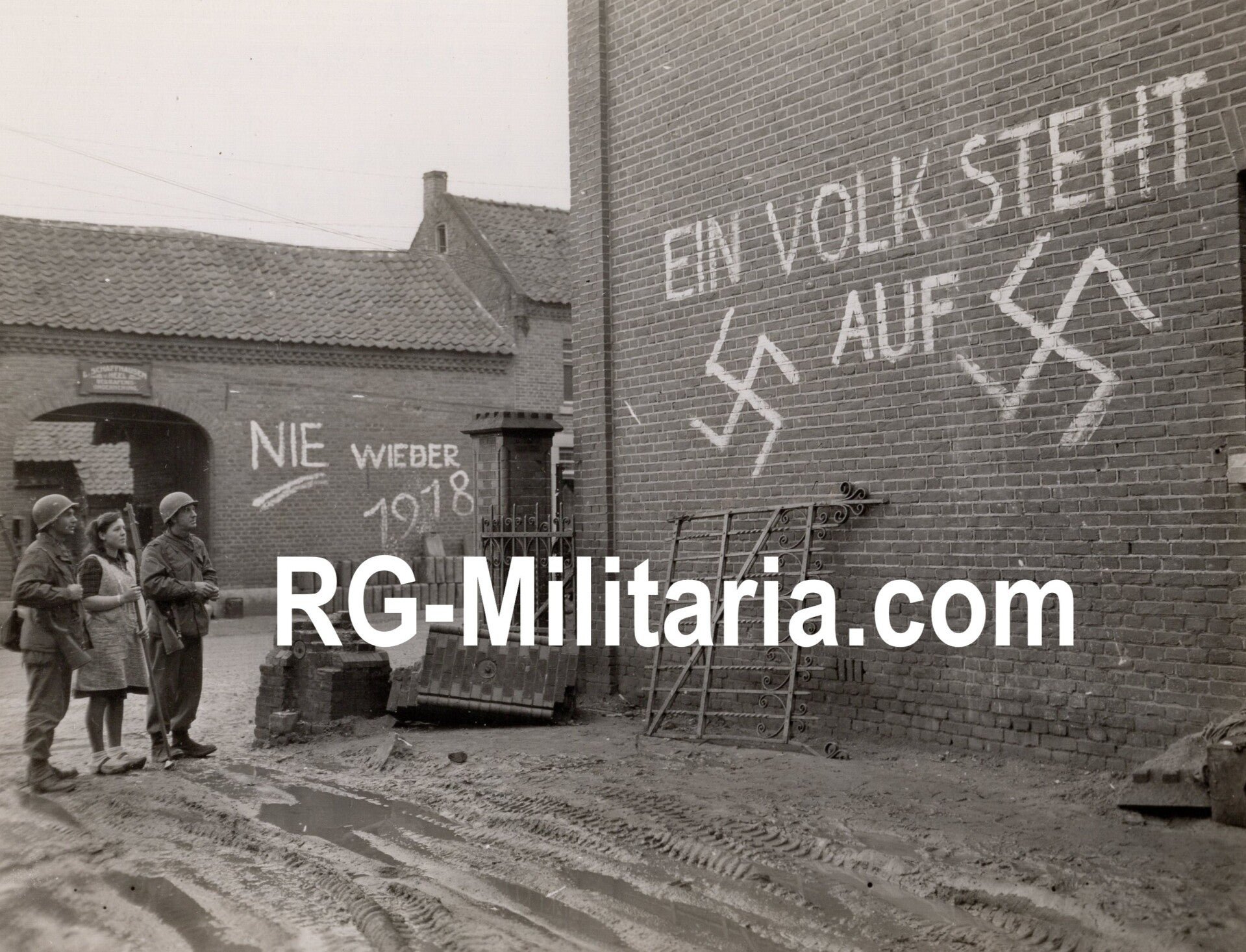 Original WW2 US Press Photo - Large graffiti wall ''Ein Volk steht auf, Nie Wieder 1918'' in Echt, Holland (1945)Approximately 13 x 10 cmBy Charles R. Pearson.Limburg. Graffiti on the wall by German soldiers as they left Echt, liberated by American soldiers. US soldiers and a farmers girl are looking at the grafitti.Originele Wo2 Amerikaanse Persfoto - Duitse graffiti ''Ein Volk steht auf, Nie Wieder 1918'' in Echt, Nederland (1945)Ongeveer 13 x 10 cmDoor Charles R. Pearson.Limburg. Bekladde muur door Duitse militairen toen ze Echt verlieten, bevrijd door Amerikaanse militairen. Amerikaanse militairen en een boerin kijken ernaar.