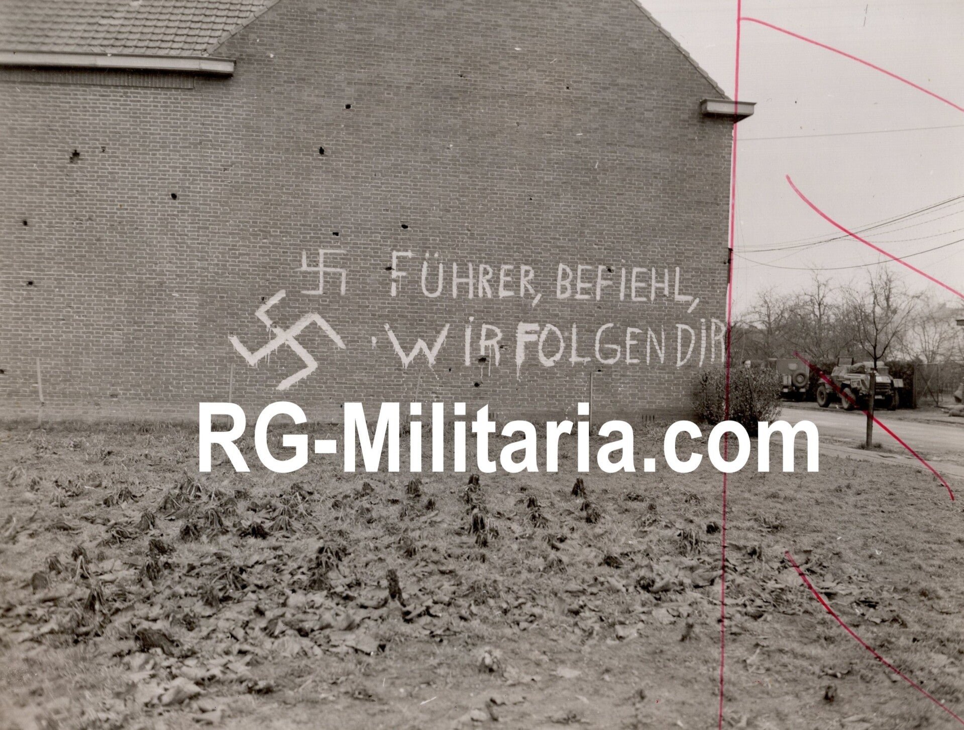 Original WW2 US Press Photo - Large graffiti wall ''Führer, befiehl wir folgen dir'' in Echt, Holland (1945)