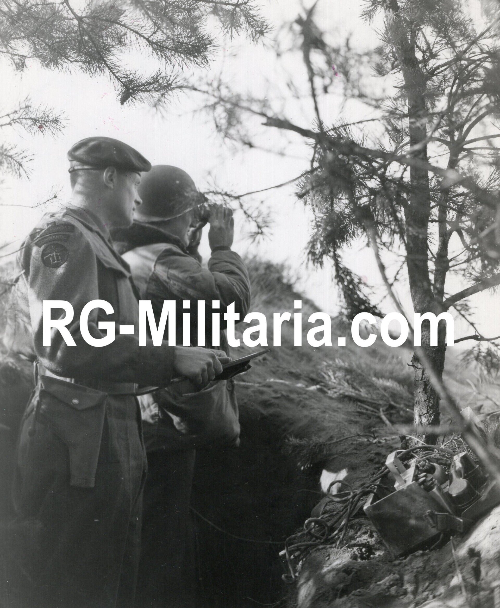 Original WW2 US Press Photo - British Royal Marines Commando and US soldiers checking out the front line at Linne, Holland (1945)