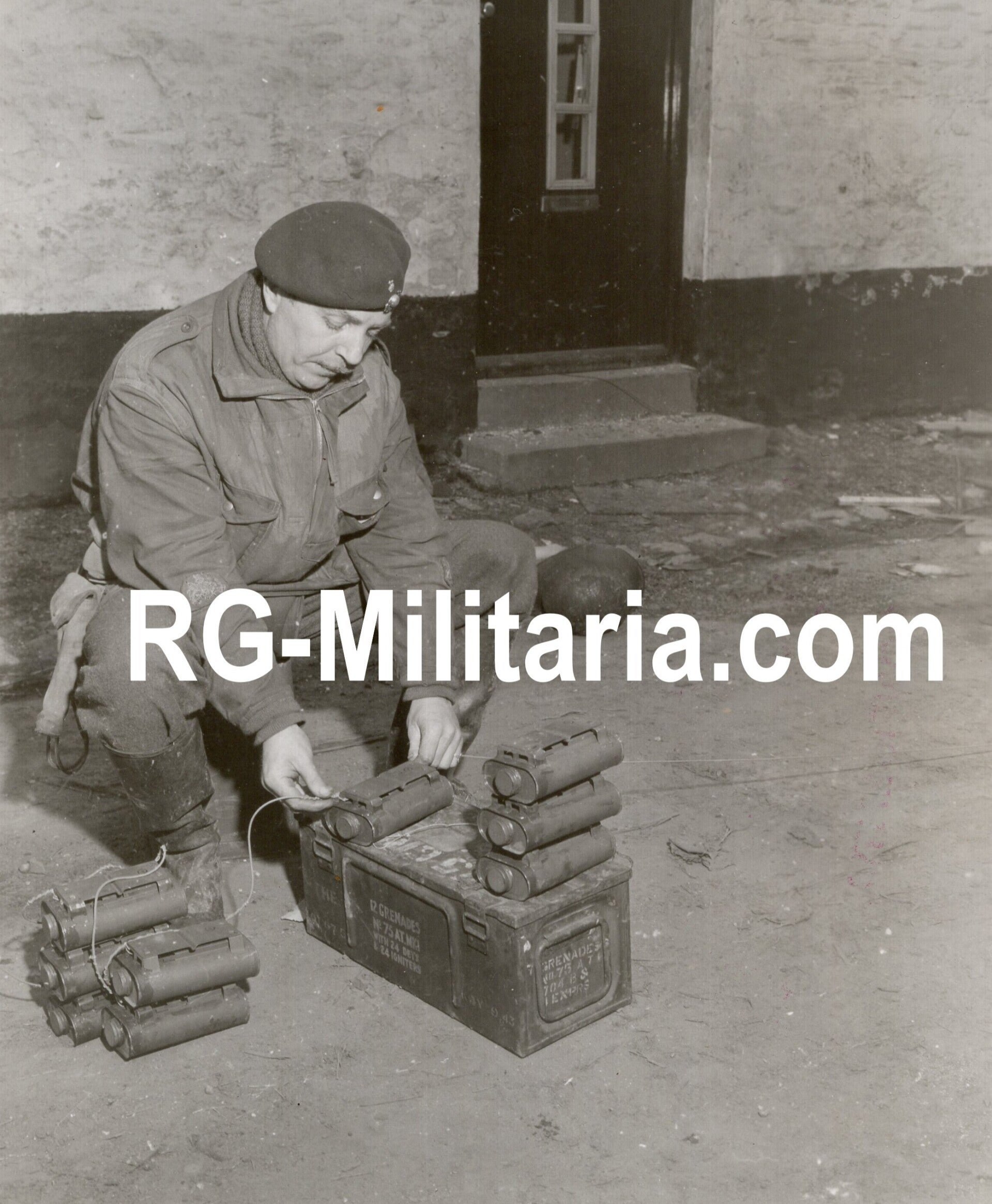 Original WW2 US Press Photo - British commando Sergeant Major preparing anti-tank grenades to capture German troops near Linne, Holland (1945)