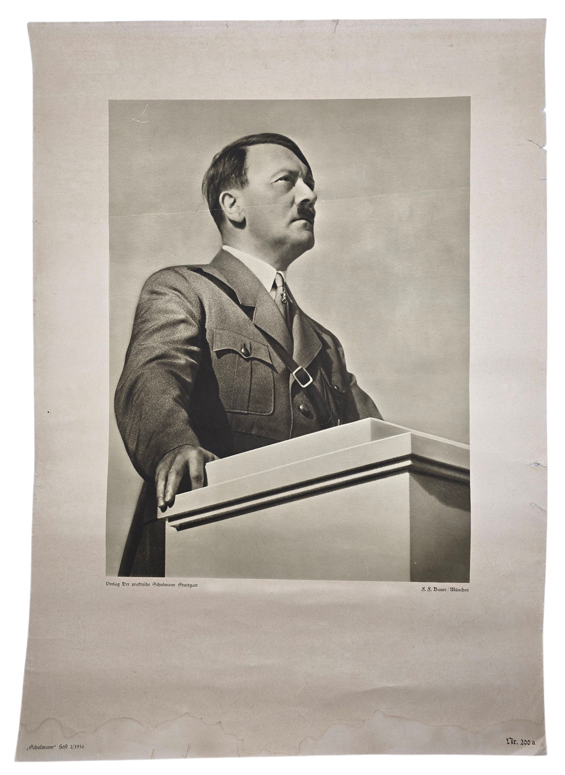 Original WW2 German Poster - Portrait Adolf Hitler, Schulmann Heft 2 (1936)Verlag Der praktische Schulmann Stuttgart, F. F. Bauer, München Nr. 200 A. Schoolposter.Approximately 70 x 50 cmFine condition, one fold at the middle of Hitler's head. See pictures. Small waterdamage at the bottom and some small tears on the sides.Originele Wo2 Duitse Poster - Portret van Adolf Hitler, Schulmann Heft 2 (1936)Verlag Der praktische Schulmann Stuttgart, F. F. Bauer, München Nr. 200 A. Schoolposters.Ongeveer 70 x 50 cm.Prima staat, één vouw in het midden van Hitlers hoofd. Zie foto's. Kleine waterschade aan de onderkant en enkele kleine scheurtjes aan de zijkanten.