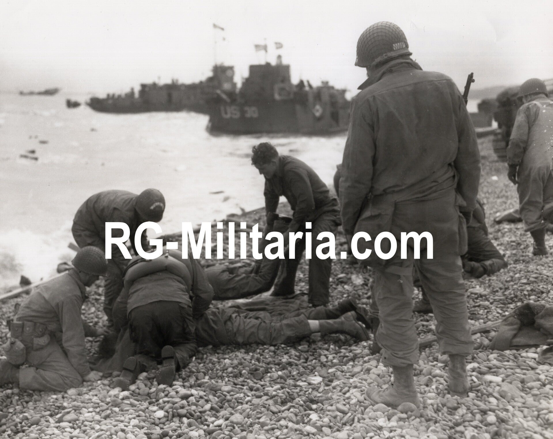 Original WW2 US Press Photo - Wounded US soldiers being treated on the shore near Cherbourg on the 6th of June, D-Day, Operation Overlord (1944)