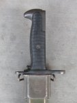 Original period manufacture. Parkerized finish, manufactured 10 inch blade with most of the original finish remaining on the blade, guard and pommel. Operable lock button, nice black plastic grips. Original GI green plastic scabbard with an unpainted steel throat.
