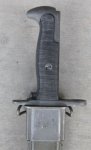 Original period manufacture. A very nice original bayonet, residing in a correct length, USN Mk1 scabbard. Nearly all of the original parkerized finish remains on the blade, guard and pommel. Nice black plastic grips with no damage, lock button is operable. The blade has the PAL name in an oval, with US bursting bomb 1943 below. Nice green plastic scabbard with a steel throat.