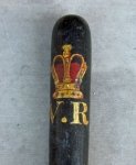 Original period manufacture. Measures 18 inches in length, turned oak truncheon with a painted crown and letters V.R. on one end. Minor chipping to the knurled end of the grip, with an old auction sticker affixed to the surface. Drilled through the grip to accept a wrist thong.