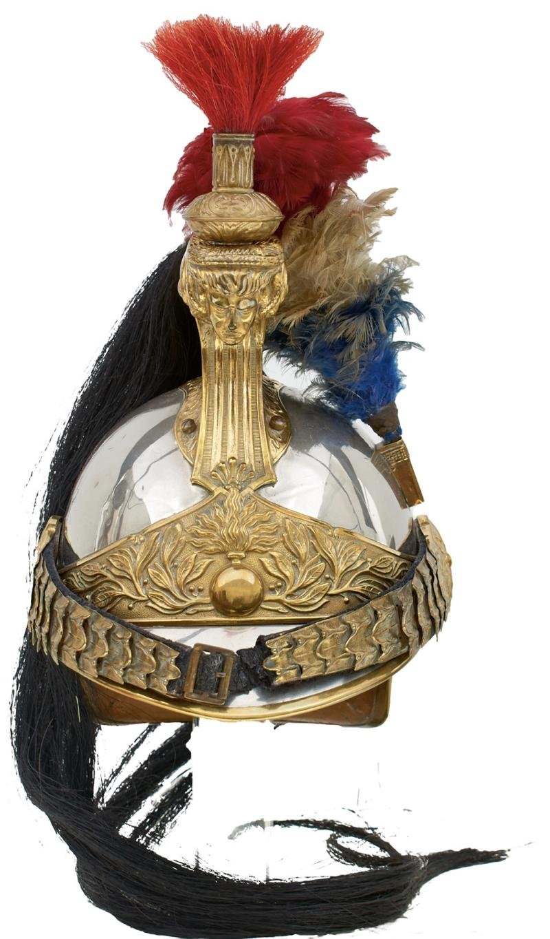 With liner, black horsehair tail and red white and blue feather plume, original chinscales with strap and buckle, virtually dent free throughout, and in fabulous overall condition. The plated metal skull with brass trim, laurel and grenade embossed headband with a stippled ground, acanthus embossed raised comb with Medusa head, acanthus and laurel embossed cushion-shaped plume holder marmousel with red horse hair plume, black horse hair mane, square section hackle holder with red white and blue feather hackle, foliate decorated bosses.There is no doubt, that despite losing to the invading Germans in the Franco Prussian War, there were no braver horse mounted combatants in the world, renown for their loyalty, dedication and tenacity in combat for La Belle France. Which continued still into WW1 40 years later.Photos and price will be added todayA magnificent French Cuirassiers helmet of the M1872 pattern. Designed immediately after the defeat of France at the Franco Prussian War. These were still in combat wear in August 1914 by the troops of the French Cuirassiers who were in that early period engaged in reconnaissance, guarding the flanks & covering the infantry as well as liaison & escort.The skull, peak & neckguard are made from cast sheet steel which from a lobster tail to the rear with Medusas head to the front of the crest & thirteen palmettes separated by water lillies. All of the fittings & the badge are of brass this including the chin scales which are adjusted by use of a partially concealed strap inner buckle system. The plume socket is set into the side of the helmet with its red plume. The front plate has a grenade set into two laurel branches this integrating with the bottom edge of the crest as the top grenade flame reaches upwards. To the crest is mounted black horsehair with a pleat which allowed it to be tied up so it did not flutter in the face of the cavalryman. Interior of the helmet has survived in very good order. The leather liner tongues are all good with no damage to holes.Looking back at the pre-war 1870 landscape, there are parallels that can be drawn today, including notably the role of populist disruptors in triggering international conflict. Emperor Napoleon III of France and Prussia's Otto von Bismarck were both products of the 1848 revolutions and master media manipulators who exploited the power of nationalism. Napoleon did so first, sweeping to power in the December 1848 presidential elections on the promise of 'making France great again', as it had been under his uncle, the first Napoleon. Four years later, just before his original term should have expired, he made himself emperor, and quickly reasserted French prestige by launching a succession of wars, including against Russia in the Crimea (1853-56).Napoleon III's wars had unintended outcomes. One of these was that they turned Russia from being a bastion of the international order into a revisionist power. This in turn gave space to Bismarck to wreck what remained of the European system in a way that was definitely not to France's advantage. Austria was the main victim initially in the shake-up that followed, losing its position in Italy following military defeat at the hands of France in 1859, and more spectacularly forfeiting its prime role in Germany to Prussia after defeat in 1866.This set the scene for the 1870 Franco-Prussian war. France, determined to thwart Prussia's further rise, sought to block the candidacy of a Prussian prince to the Spanish throne in what looked like a good, old-fashioned, dynastic succession crisis. What made things different from earlier centuries was the weight of public opinion, in an age of universal male suffrage. Policy makers in Berlin and Paris sought to exploit the rising tide of nationalism on both sides of the Rhine, and this increased the risk of an explosion. That explosion came on 19 July.A rapid French routExperts at the time expected the French to win. They overlooked serious weaknesses on the French side, which Sir Michael Howard's analysis shows extended far beyond the narrow military field, to wider political and societal disadvantages. These were reflected above all in the French conscription system, inherited in its essentials from the first Napoleon. This imposed upon the male population an obligation to serve, but in practice, only a small fraction was ever called up, who then served for seven years and often more. In consequence, the French army lacked the ability to 'scale-up' by calling on a mass of reservists.The Prussian army, in contrast, drew upon the entire male population, producing a substantial body of trained reservists upon mobilisation. Prussian military planning, conducted by the famed General Staff headed by Helmuth von Moltke, made best use of the resulting numerical advantage, not least through the clever exploitation of railways.Many military observers nonetheless preferred the French system, which produced an essentially professional force that was far better-suited to the near-continuous overseas deployments that Napoleon III's global ambitions demanded. Most damaging of all, despite its elitist pretensions, the French army was socially rather low-status. This was because the rich were allowed to pay for replacements to serve instead of their sons, should they be unlucky enough to be called up. No such facility existed in Prussia, with the result that its army more fairly approximated the nation-in-arms.The consequence in 1870 was a French rout. General Philip Sheridan, American Civil War veteran, observed the Franco-German conflict at first hand, and his summary of the reasons for the outcome can hardly be bettered:'The earlier advantages gained by the Germans may be ascribed to the strikingly prompt mobilization of their armies, one of the most noticeable features of their perfect military system, devised by almost autocratic power; their later successes were greatly aided by the blunders of the French, whose stupendous erro